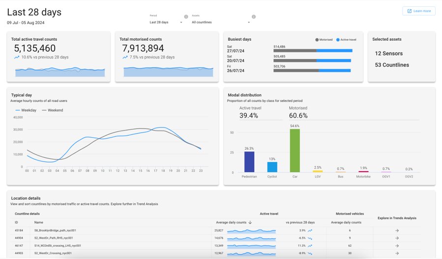 Methodology: The devices combine a camera sensor and on-board computer to process live video which provide counts of cars, buses, trucks, bicycles, and pedestrians. Information such as speed, turn counts, dwell times, and conflicts are also reported. The data, not video, is stored in a database and accessed through a visualization software.